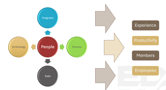 All this means we need to look at a total change on all – People, Process and Technology leveraging Data as the fuel and delivered through Programs to attain business outcomes on both Experience and Productivity of Members and Employees. There is also a need to think of a new type of experience that satisfies all kinds of member personas. This experience must be available as omni-channel and personalized to the individual needs.